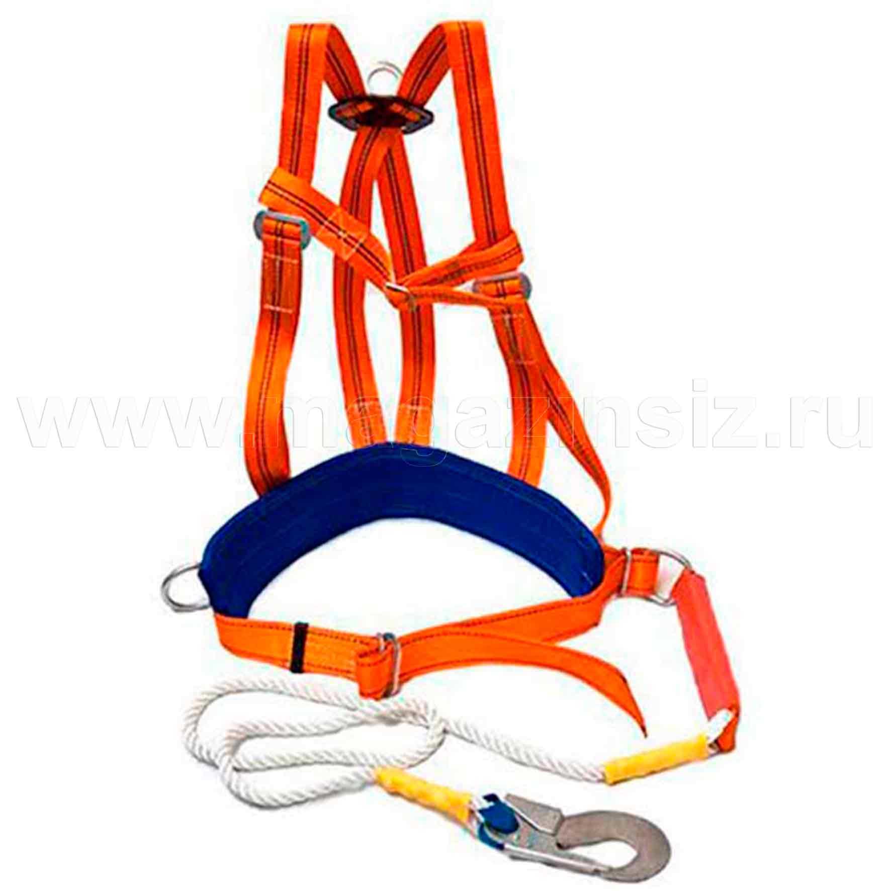 Строп-полиамидный канат 1440 мм, амортизатор - специальное устройство , состоящее из сложенной вдвое и простроченной технологически отработанным швом полиамидной ленты, это позволяет при падении рабочего погасить, смягчить последствия динамического удара при падении с высоты.