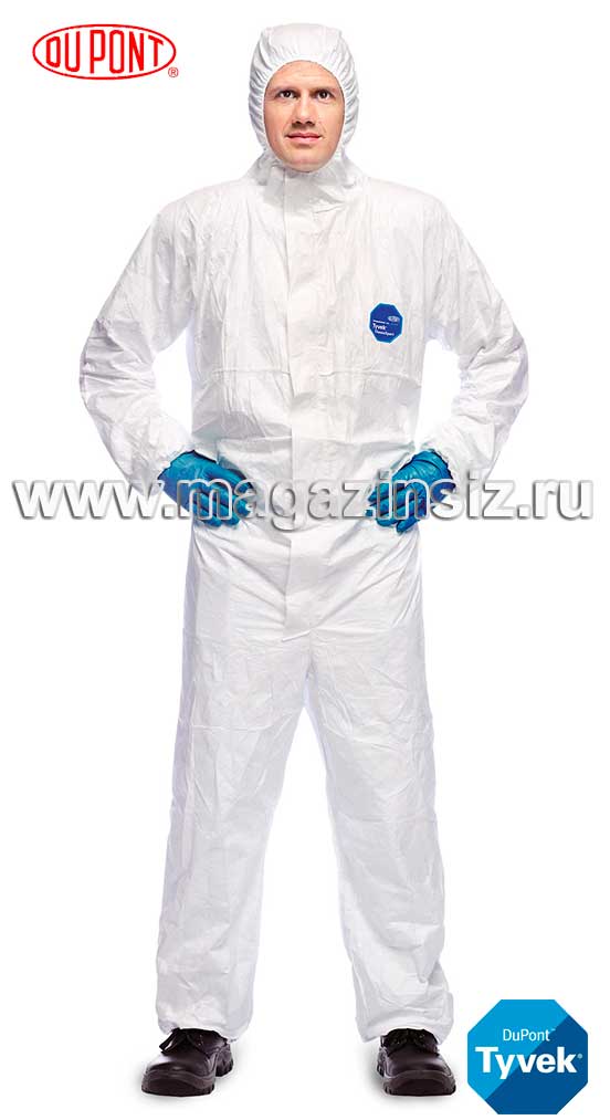 DuPont™ Тайвек® 500 Xpert (Тайвек® Классик Эксперт), модель CHF5a. Комбинезон с капюшоном, цвет: белый (также в наличии синий и зеленый), размеры: от S до XXXL. Прочный и при этом очень легкий (масса на одно изделие менее 180 г). Капюшон из трех деталей обеспечивает оптимальное прилегание и свободу движений головы. Эластичные вырез капюшона, манжеты и низ брюк, вклеенная эластичная вставка талии. Просторная область клина шагового шва обеспечивает свободу движений. Увеличенный, удобный язычок бегунка застежки-молнии.
