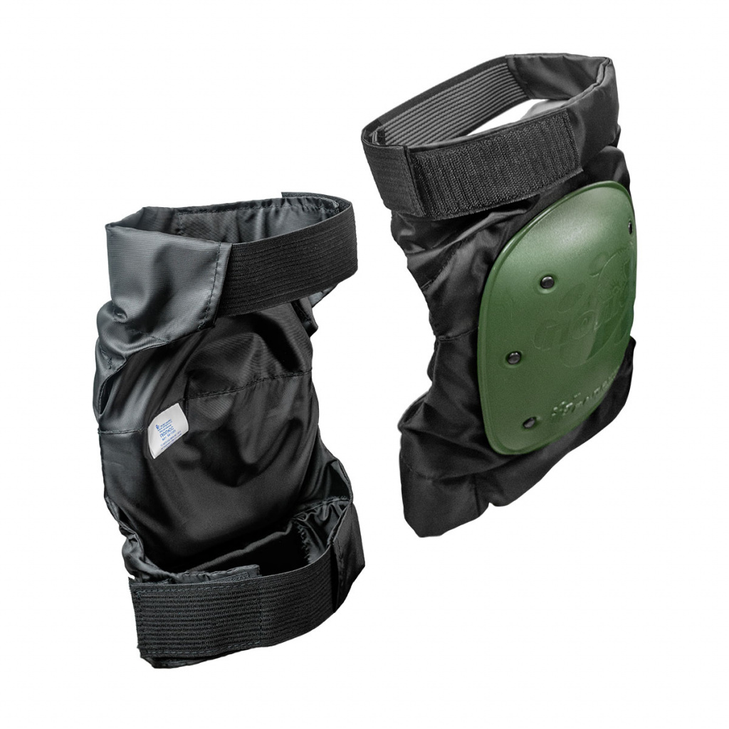 Наколенники с защитной чашкой. Основа наколенников изготовлена из высокопрочной синтетической ткани "Оксфорд" плотностью 210 г/кв.м. На внешней части наколенника закреплена ударопрочная защитная чашка из полиэтилена низкого давления (ПНД). Под чашкой находится амортизирующая вставка из пенопропилена. Крепление – широкие эластичные ленты-липучки.