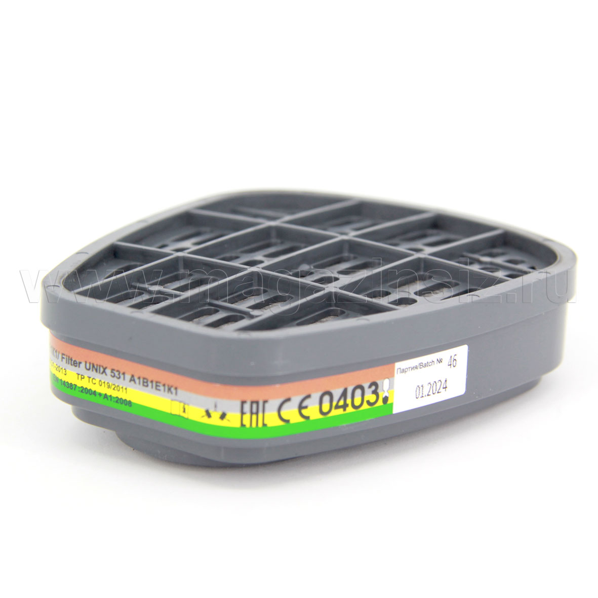 Фильтр UNIX (Уникс) 531 А1В1Е1К1 (ДОТэко 120 марка А1В1Е1К1) Фильтр предназначен для защиты органов дыхания (в комплекте с лицевой частью) от воздействия органических газов и паров с температурой кипения выше 65°С, неорганических и кислых газов и паров, аммиака и его органических производных.